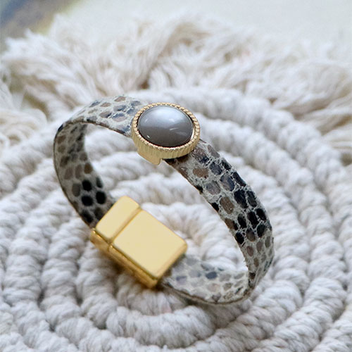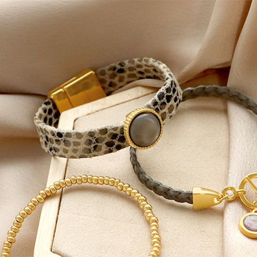 Mit diesen inspirierenden Schmuckartikeln stellen Sie ganz einfach eindrucksvolle Armbänder her. Verwenden Sie z. B. DQ-Leder, auf das Sie modische DQ-Perlen für ein Doppelarmband auffädeln. Für einen sauberen Abschluss stecken Sie die Enden des Lederbands in Endkappen und für den Verschluss befestigen Sie einen Karabiner mit Verlängerungskette. Sie können auch einen Cabochon in eine passende Fassung kleben und schieben ihn über das Lederband mit Schlangenmuster. Aus dem gleichen Lederband können Sie auch eine trendige Handyschnur anfertigen.
