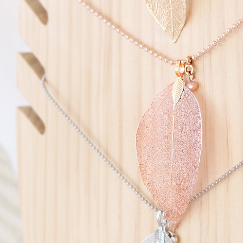 Feine Ketten verziert mit Blatt Anhängern aus echten metallbeschichteten Blättern