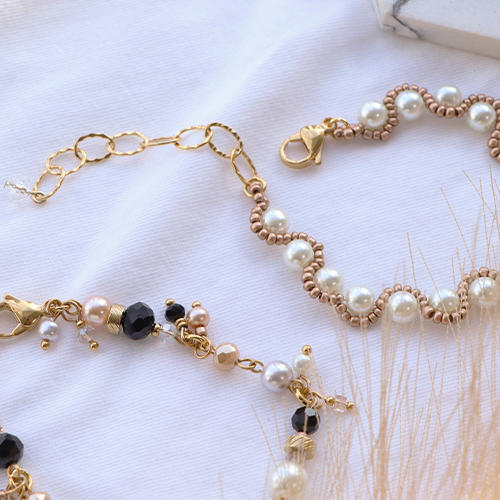 Sie lieben Glasperlen? Tolle Armbänder gestalten Sie, indem Sie eine schöne große Perle auf einen Kettelstift aufziehen und zu beiden Seiten eine Öse legen. Kreieren Sie mehrere dieser Zwischenstücke, die Sie dann mit einem Bindering verbinden. An die Binderinge hängen Sie anschließend kleinere Perlen und gestalten mithilfe eines Nietstiftes einen Anhänger. Oder entwerfen Sie Ohrringe mit Glasperlen in vier Größen in Kombination mit Miyuki-Beadingkordel und Rocailles-Perlen. Nach dem gleichen Muster gestalten Sie auch Armbänder oder Ketten mit gleich großen Glasperlen.