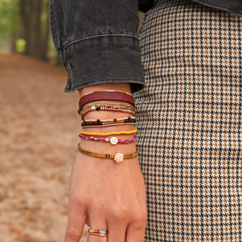 Sie können Sets auf endlos viele Arten erstellen. Aber Sie erhalten die besten Sets, wenn Sie verschiedene Arten von Perlen kombinieren. Zum Beispiel haben wir für dieses Herbstset Miyuki Perlen, Rocailles, Facett Perlen und Muschel Perlen verwendet. Sie können leicht eine Kombination dieser Perlen auf Elastik reihen. Stellen Sie sicher, dass Sie Farben nehmen, die gut zusammen passen. Denn so entsteht ein wunderschönes Set. Vergessen Sie nicht, zum Beispiel Jasseron oder Stainless Steel Perlen zu verwenden. Sie können dann eine passende lange Kette aus Jasseron herstellen und sie mit Blumen aus Rocailles dekorieren. Oder reihen Sie eine Kette aus verschiedenen Perlen in den Trendfarben dieser Saison auf Metalldraht!