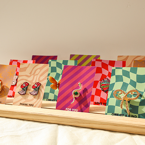 Diese neue Serie Broschen und Pins bringt frischen Wind in Ihre Accessoires! Ob eine elegante Schlange, ein funkelnder Blitz oder eine niedliche Schildkröte, jede Brosche ist stilvoll. Und für die, die die fröhliche Seite des Lebens lieben, gibt es Pins mit Sprüchen wie „Good Vibes Only“ und „Keep on Smiling“. Passend zu unseren Broschen und Pins können Sie unsere Schmuckkarten bestellen, die von unserem hauseigenen Designteam entworfen wurden. Die farbenfrohen Designs sind nicht nur ein Blickfang, sondern auch das perfekte Highlight für jedes Outfit. Schnell bestellen.