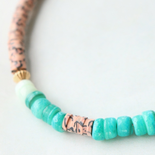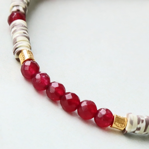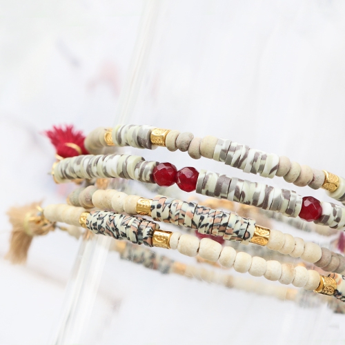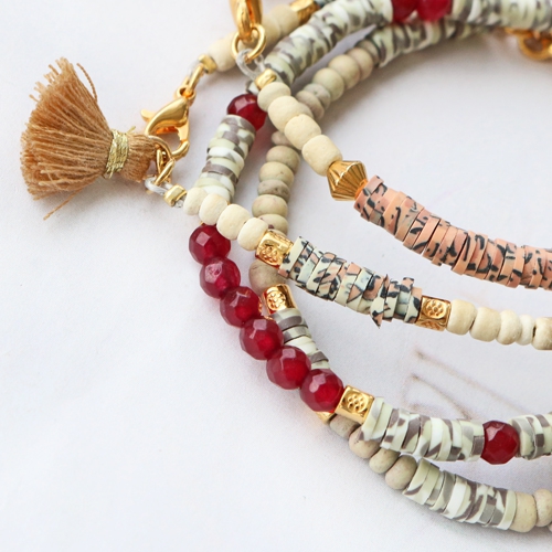 Diese super schöne Armbänder sind super. Wenn Sie die Katsuki Perlen mit Army print und Camouflage print mit den richtigen Artikeln kombinieren, machen Sie high end Design mit perfektem Look. Kombinier die Katsuki Perlen mit natürlichen Produkten wie z.B. Kokos Perlen, Natursein Perlen, Facett und Muschel Perlen disc. Verwend kleine Perlen aus DQ Metall mit vielen Details zwischen den Perlen. Reih die kleinen Perlen auf Metall Draht und verwend Quetschperlen um eine Lasche am Ende zu machen, um einen Bindering daran zu befestigen. Nehmen Sie einen Karabiner Verschluss als Verschluss dazu. Den übrigen Draht können Sie zurück stecken und abschneiden. Mit einer schönen Quaste oder DQ Metall Anhänger machen Sie das Armband komplett. Durch besondere Farbkombinationen auzuprobieren entwerfen Sie einen echten Blickfang. Super modisch also!