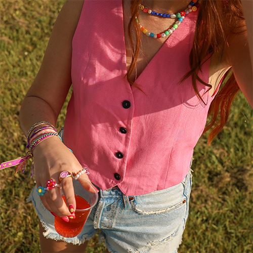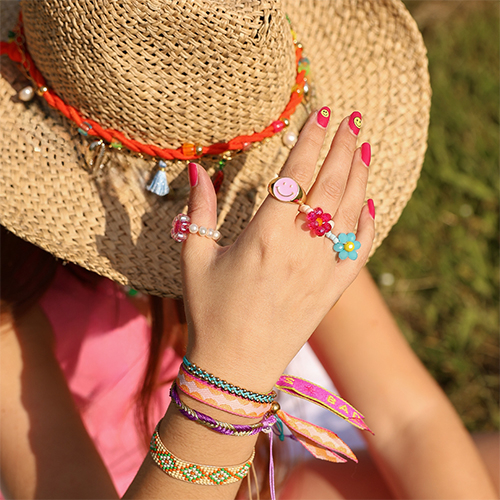 Hier eine exklusive Auswahl an Must-haves-Accessoires, die jedes Festival-Outfit perfekt ergänzen. Halsketten mit Acryl-(Buchstaben)-Perlen sind der absolute Hit dieser Saison. Kombiniert mit süßen Polymer-Früchtchen und die trendigen Keramik-Smileys verleihen sie jedem Outfit eine unwiderstehlich verspielte Note.