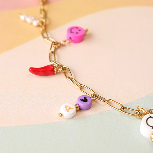 Sind Sie bereit, super bunten und fröhlichen Schmuck zu entwerfen? Dann legen Sie los mit der neuen Polymerperlen-Kollektion! Sie können diese trendigen Halsketten mit klobigen Jasseron-Gliedern, großen Süßwasserperlen, Acryl-Buchstabenperlen und verschiedenen Anhängern gestalten. Polymer-Perlen sind sehr farbenfroh, aber Sie können die Artikel auch stilvoll verwenden. Machen Sie zum Beispiel ein Zwischenstück aus Süßwasserperlen und einer Polymerperle. Sie können dazu einen Kettennagel verwenden oder ein Stück Metalldraht an beiden Seiten der Kette befestigen. Kreieren Sie auch eine trendige Gliederkette durch verschiedene Charms zum Schmuck. Wie wäre es mit einem roten Paprika-Charme? Verwandeln Sie die Polymerperlen, wie z. B. die Smileys, einfach mit einem Kettenstift in einen Anhänger. Viel Spaß mit diesen fröhlichen Artikeln und werden Sie kreativ!