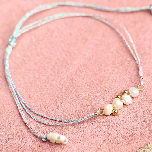 Diese neue Serie Makramee-Band ist ein Muss für deine Sommerkollektion. Ihnen steht das Band in verschiedenen Glitzerfarben wie Lila, Hellblau, Rosa, Weiß und Gold in den Stärken 0,8 mm und 1,00 mm zur Auswahl. Mit diesem Band kreieren Sie in Kombination mit Rocailles, Perlmutt-, Edelstahlanhängern und Perlen Ihrer Wahl trendige Ketten, Arm- oder Fußbändchen für den Sommer.