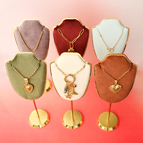 Unsere neuen Displays sind zierlich, stilvoll und perfekt, um Ihren Schmuckstücken die Präsentation zu verleihen, die sie verdienen. Sie können sich für verschiedene Formen wie Hals, Ohr, Blume und Herz in bezaubernden Farben wie Weiß, Grün, Blau oder edlem Bordeauxrot entscheiden. So geben Sie Ihren Schmuckstücken die Präsentation, die sie verdienen.