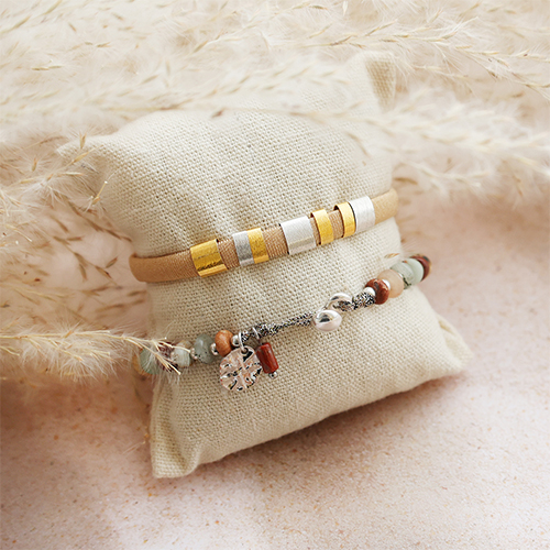 Mit diesen Teilen entwerfen Sie spielerisch Schmuckstücke, die zu einem natürlichen und bodenständigen Stil passen! Wählen Sie ein elastisches Band Ibiza, das gut zu den Schiebern aus dieser Kollektion passt. Damit können Sie Armbänder kreieren, die Sie mit einer eleganten Smart Stopperperle schließen. Oder fädeln Sie ein Armband auf Makramee-Band im Metallic-Look und wählen Sie verschiedenfarbige Natursteinperlen, die Sie mit DQ-Metallperlen abwechseln. Die DQ-"Sicherheitsnadel" lässt sich wunderbar als Blickfang in eine Gliederkette einbinden.