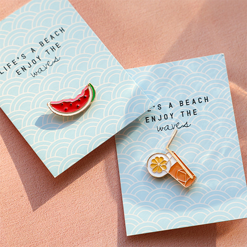 Die Broschen und Pins aus dieser neuen Serie wecken Summer-Vibes! Die Broschen gibt es von verspielten Kaktus- und Blumenformen bis hin zu fruchtigen Motiven wie Kirschen und Zitronen. Die Pins sind mit verschiedenen Texten und sommerlichen Motiven wie Erdbeeren, Palmen, Flamingos und Äpfel erhältlich. Perfekt, um jedem Outfit einen fröhlichen Touch zu geben!