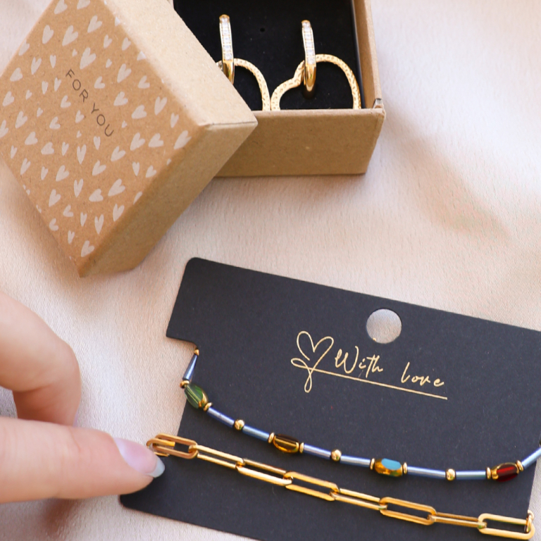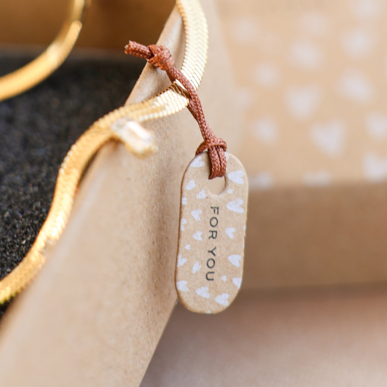 Wer liebt nicht ein hinreißendes Schmuckstück, verpackt in einer einzigartigen Box mit einer persönlichen Note? Unsere eigens gestalteten Boxen und Karten, mit Aufschriften wie " For you" und " Pretty things inside", zaubern garantiert ein Lächeln auf die Lippen Ihrer geschätzten Kunden!