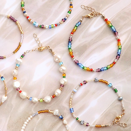 Diese trendigen Armbänder machen Spaß beim Basteln und beim Tragen! Durch die Verwendung von Metalldraht erhalten die Armbänder sofort eine schöne runde Form. Wechseln Sie mit verschiedenfarbigen Preciosa Rocailles ab und verwenden Sie größere Perlen wie Süßwasserperlen oder eine kleine Kaurimuschel für ein elegantes sommerliches Ergebnis. Schließen Sie die Armbänder mit Kalotten und Verlängerungsketten ab und hängen Sie einen schönen Anhänger zur Dekoration daran.