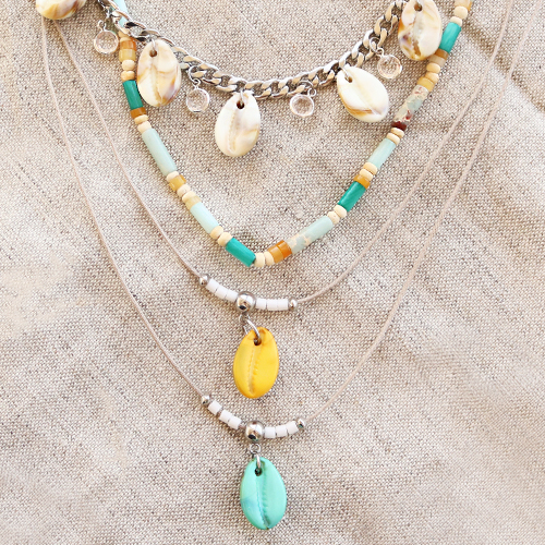 Reihen Sie dann Miyuki oder Natursteinperlen zusammen mit einer Resin Kauri Muscheln über Makramé Band und machen Sie am Ende einen Schiebeknoten. Sie können auch einen schönen Anhänger oder eine Perle an die Enden der Kette hängen. Möchten Sie einen kompletten Satz erstellen? Dann reihen Sie eine Kette aus Natursteinperlen in passenden Farben auf Elastik.