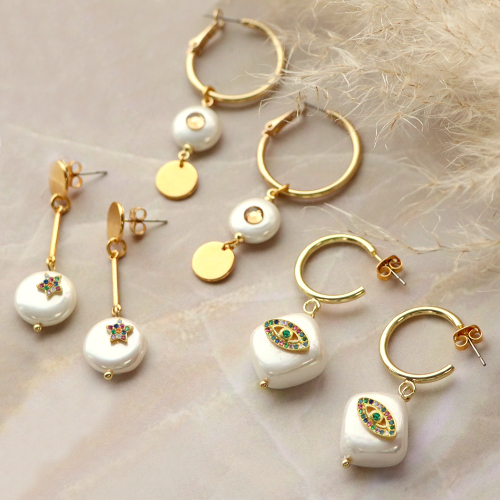 Mit dieser Muschel Pearl Shine Kollektion gestalten Sie echte Eyecatcher! Das besondere an dieser Kollektion: Alle Elemente können individuell kombiniert werden. Aus Pearl Shine Perlen, Anhängern und Zwischenstücken, Zirkonia Brass Elements und Swarovski-Flatbacks entstehen wunderschöne Schmuckstücke für Ihr Sortiment. Die Zirkonia Brass Elements lassen sich ganz einfach mit etwas Strasskleber auf die Perlen aufbringen. Kombinieren Sie dazu ganz nach Ihrem Geschmack auch anderes Schmuckzubehör aus unserem Angebot! Probieren Sie zum Beispiel eine Kombination aus Muschel Pearl Shine Perle, Zirkonia Brass Elements sowie einer Metallperle in Designerqualität. Einfach auf einen Nietstift reihen und mit einer Rundzange eine Öse drehen. Dann den Anhänger einfach an einen Metallohrstecker in Designerqualität hängen – fertig! Jetzt angesagten Schmuck gestalten mit den verzierten Perlen und Zwischenstücken aus dieser Kollektion. Für welche Kombination entscheiden Sie sich?