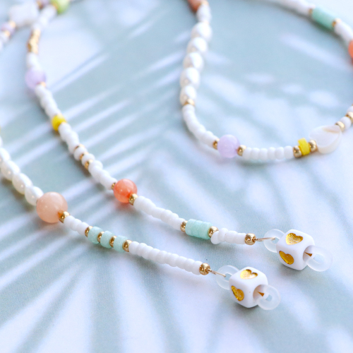Bekommen Sie auch dieses glückliche Kribbeln im Bauch, wenn Sie an den Sommer denken? Der Strand, die Sonne, diese wunderbare Sommerbrise. Genau wie die Sonne wollen Sie in einem Sommer-Outfit strahlen. Eine trendige Sonnenbrillen-Kordel darf bei diesem Look nicht fehlen. Die neue Kollektion der Sonnenbrillen-Kordelenden ist eine gute Grundlage für die Gestaltung der buntesten Sonnenbrillen-Kordeln. Wählen Sie ein fertiges oder erstellen Sie Ihr eigenes Sonnenbrillen-Kordelende, indem Sie eine Perle mit einem Reihloch von mindestens 4,2 mm über das Brillen-Kordelgummi fädeln. Befestigen Sie Nylon- oder Metalldraht am Brillenschnurende und legen Sie los. Gestalten Sie ein verspieltes Muster mit Rocailles-Glasperlen und verschiedenen anderen Perlen. Eine Sonnenbrillen-Kordel aus farbigen Ketten und Acryl-Kette ist auch eine super schöne Option. Legen Sie los, kreieren Sie und lassen Sie die Sonne scheinen!