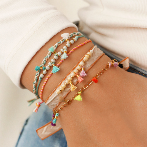 Da diese Mini-Quasten sehr klein sind, passen Sie perfekt zu feinem Bandmaterial, woraus Sie hippe Armband-Sets erstellen können. Wählen Sie zum Beispiel ein Makramee-Band oder eine schmale Jasseron-Kette. Gestalten Sie Doppelarmbänder mit 2 verschiedenfarbigen Makramee-Bändern und kombinieren Sie die Quasten mit DQ-Metallperlen und Rocailles. Die Mini-Quasten sehen auch an Creolen besonders hipp aus und lassen sich ganz einfach mit einem Biegering daran befestigen.