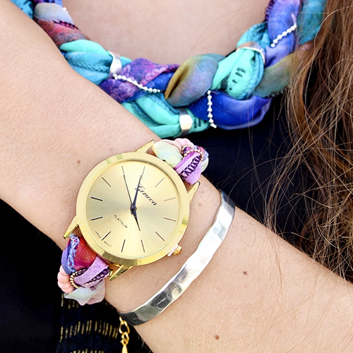 WOW! Was für ein super Inspirationsset ist das! Wir haben die Geneva Uhr in goldfarben verwendet um eine einzigartige Armbanduhr zu machen. Das Band der Uhr ist aus Bohemian Satin Band gemacht in Kombination mit Rocailles und DQ Metall. Was für ein super schöner Effekt! Dazu haben wir eine passende Kette aus Bohemian Satin Band und DQ Metall gemacht. Das darf in Ihrer Schmuck Kollektion nicht fehlen! Die neue Wickel Kordel ist super schön für Schmuck z.B. dieses schöne Armband. Diese Korde list wirklich super zu verarbeiten. Es hat einen Draht und ist dadurch biegsam.